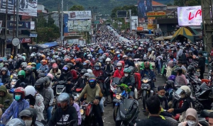 Antrean kendaraan tampak mengular dari Tugu Kujang Jalan Otista hingga Balai Kota Bogor. Kemacetan juga terjadi di Jalan Kapten Muslihat arah simpang Jalan Juanda.